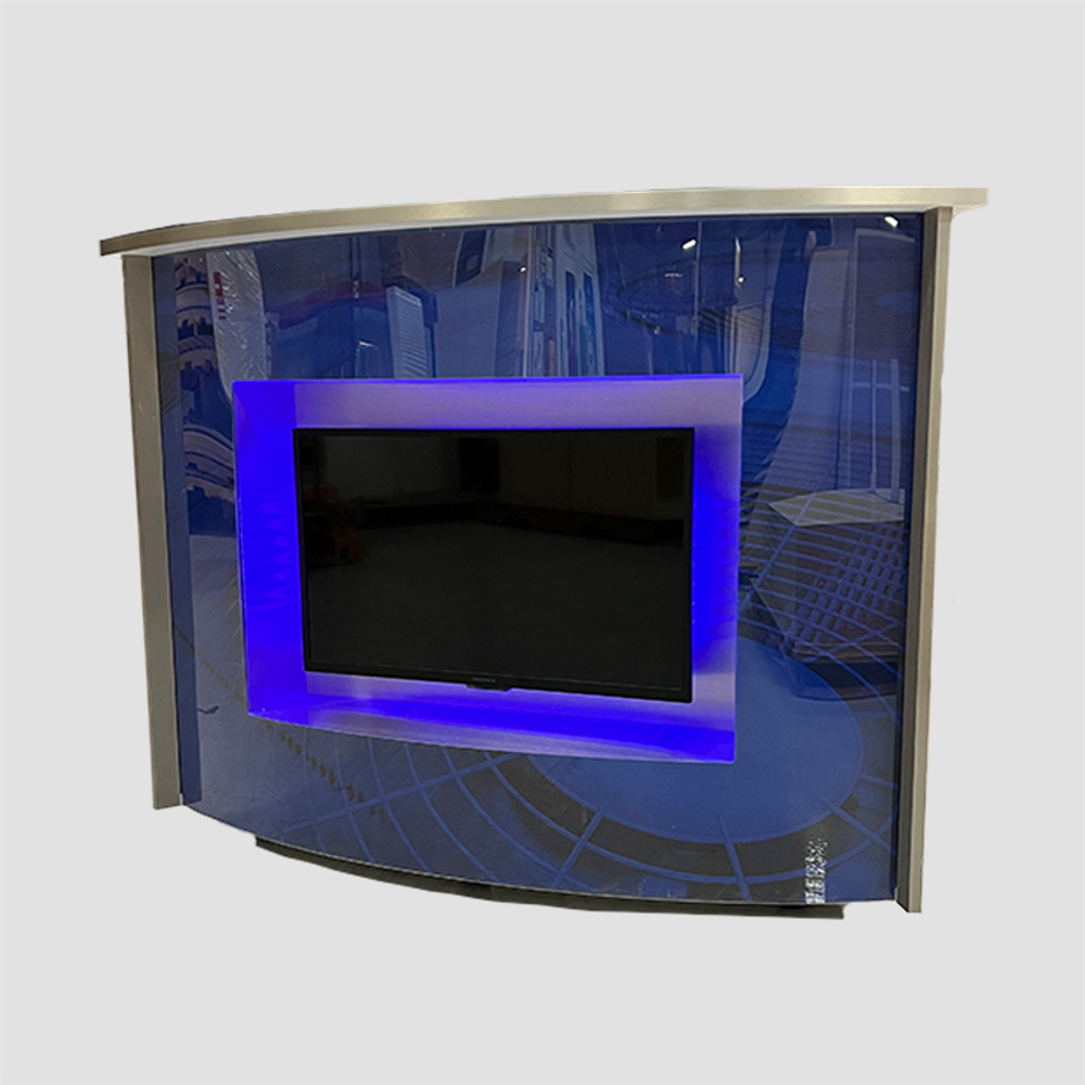 5' wide Vendor Desk, with vinyl wrapped front face with acrylic protective cover, and television for media.