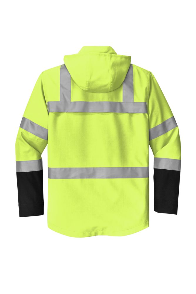 100% polyester 300-denier ripstop shell with durable water-repellent (DWR) finish • 100% polyester lining • Black bottom front and lower sleeves for a cleaner appearance • Shell's fabric waterproof rating: 5000MM • Fully seam-sealed shell • Adjustable rain hood • Durable, reflective 2-inch tape meets ANSI 107 requirements • Full-length interior and exterior storm flaps • Vented cape back • Right chest pocket and retractable ID holder • Two lower front pockets • Center front zippered pocket to hold a tablet • Gusseted cuffs • Elastic hem • Decoration access pocket in shell • Non-ANSI, 8.6-ounce, 100% polyester inner full-zip hoodie • Hoodie can be attached inside shell • This garment must be fully zipped to be in compliance with ANSI 107 standards